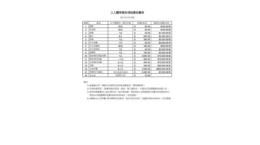 隨著本澳經濟發展通漲亦逐步攀升,工人體育場的保養、維修、營運成本不斷增加,故由2021年1月1日起工人體育場場地及設施收費將作酌量調整。新收費如圖所示。查詢電話: 28436108。