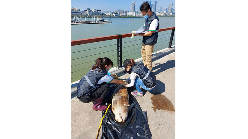 市政署接報後,即時安排人員到現場跟進。經檢查和初步測量後,鑑定該動物屍體屬雄性幼年江豚,體長1.2米,發現時體表皮膚已全部脫落,體表破裂且器官外露,屬嚴重腐爛,估計死亡後隨海水漂流至發現的水域。