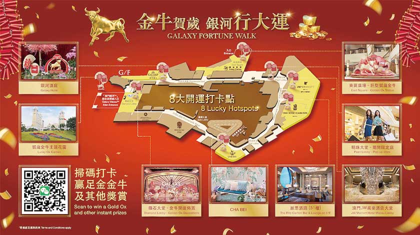 金牛開泰行大運,星際酒店,「澳門銀河」世界級奢華綜合度假城及「澳門百老匯」送上好運與好禮,讓賓客感受新春佳節的熱鬧歡愉,並享受精彩無限的一站式開年之旅。其他六大新春開運體驗優惠多多,更多活動詳情,可瀏覽「澳門銀河」官方網站:https://www.galaxymacau.com/zh-hant/23gs/ 。