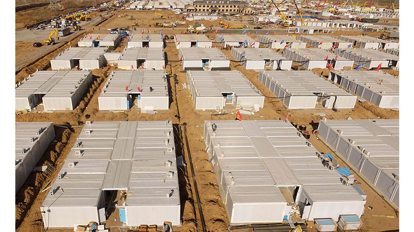 18日在石家莊黃莊公寓隔離場所施工現場,由中鐵建工負責施工的第三隔離分區504套集成房屋完成主體拼裝並交付,後續待衛浴等進場安裝後可投入使用。至此,經過5天奮戰,已有1512套集成房屋完成主體拼裝。圖為航拍完成主體拼裝的集成房屋。(中新社記者 諶詩雨 攝)