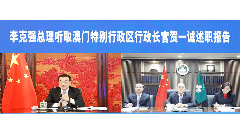 【中新社北京1月27日電】國務院總理李克強27日上午在中南海紫光閣以視頻連線方式聽取澳門特別行政區行政長官賀一誠2020年度的述職報告。賀一誠匯報了澳門特別行政區政府過去一年工作和當前形勢。