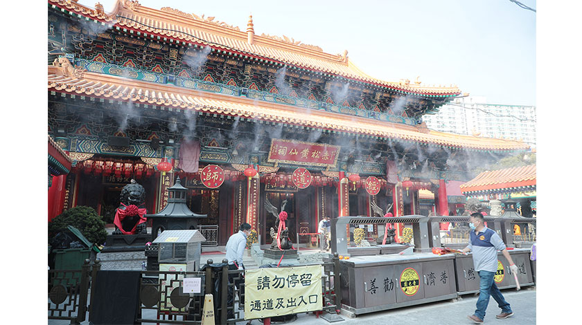 【香港中通社1月27日電】(香港中通社記者張海德攝)近日香港黃大仙祠內部多處正在裝修。農曆新年將至,但本地疫情持續,社交措施限聚令下,黃大仙祠上“頭炷香”能否鬆綁,仍有不少市民關心。據了解,特區政府與業界將開會討論賀歲活動的傳播風險及探討折衷方案,但內部研究預料難如常舉行,包括可能要考慮網上求籤等,盡量避免有大型活動吸引人群聚集。