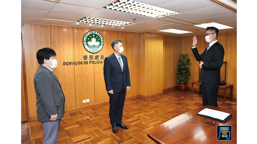 【特訊】根據保安司司長批示,由昨日起,委任司法警察局黃志康一等督察為警察總局局長助理,主管行動策劃中心。黃志康一等督察在警察總局局長梁文昌見證下,宣誓就任為警察總局局長助理一職。儀式於昨日上午在警察總局舉行,出席儀式的還有局長助理劉運嫦、王健、局長辦公室協調員趙汝民以及各部門主管及同事。