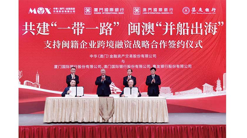 在閩澳雙方共同見證下,中華(澳門)金融資產交易股份有限公司與廈門國際銀行集團成員單位簽署了支援閩籍企業跨境融資戰略合作協定。根據協定,各方將推進資源分享、優勢互補,積極統籌協調境內外兩個市場,共同支持福建企業拓寬境外融資管道,助推閩澳金融合作務實落地。