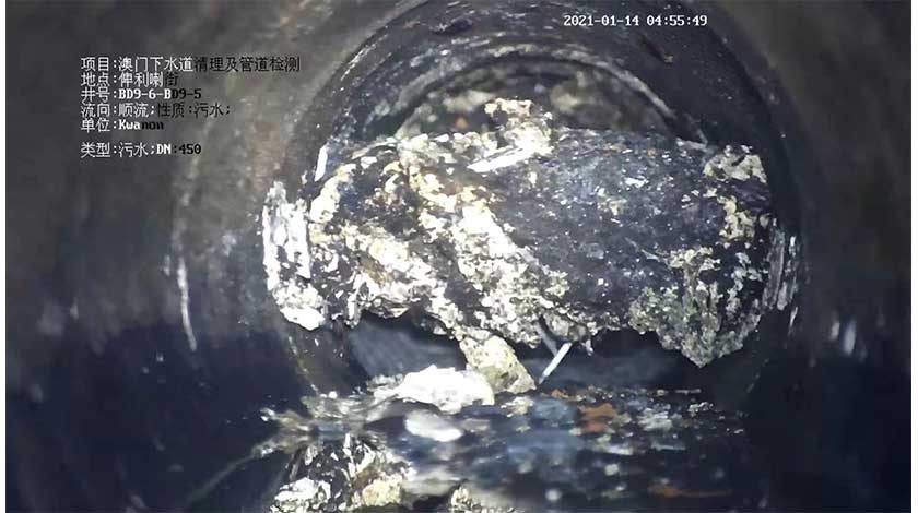 日前,市政署對羅利老馬路至高士德大馬路之間的俾利喇街進行渠道檢查,透過檢測儀器確定一段約二百米的下水道內積有大量固結油脂物,部分油脂污物幾乎佔管徑截面一半,從影像推斷固結已久,必須儘快清除。由於淤積渠道位處主要交通幹道,為免影響市民出行,經與交通部門協調,已連夜於凌晨安排緊急清疏工作,期間續使用儀器輔助污物定位及監控清淤成效,共清理出約四千二百公斤油脂和污物。