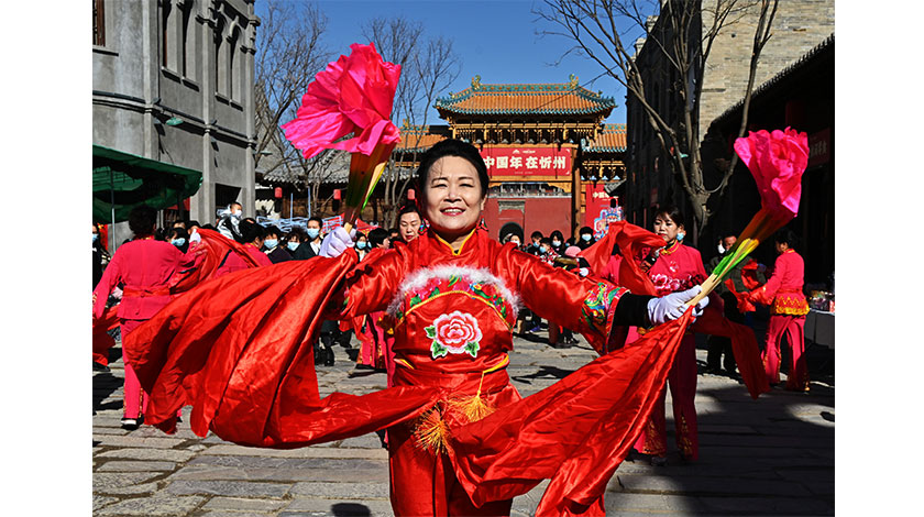 這是2月16日在忻州古城內拍攝的扭秧歌表演。大年初五,山西省忻州市忻府區在忻州古城舉辦具有濃郁地方特色的文藝表演和民俗活動,前來觀光的遊客得以大飽眼福。(新華社記者馬毅敏攝)