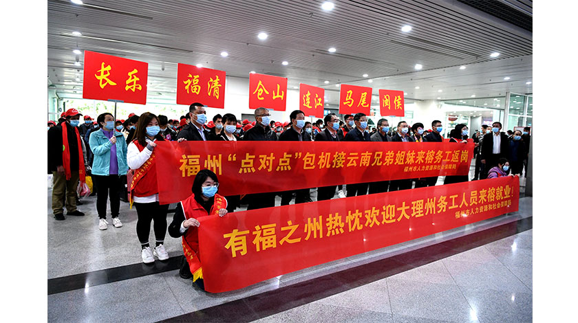 19日,來自雲南省的170名外來務工人員經過核酸檢測後,乘坐免費包機抵達福州。這是牛年春節後,福州市首趟『點對點』包機運送中西部地區農民工返榕復工。圖為福州市相關部門和用工企業到機場歡迎外來工返崗復工。(中新社記者 王東明 攝)