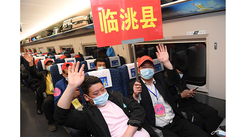 21日,來自甘肅省定西市臨洮縣的務工人員在蘭州西開往福州的G1901次列車上。當天,500多名來自甘肅省定西市的務工人員搭乘G1901次列車抵達福州。這是閩隴兩省間2021年首趟返閩務工專列。(新華社記者 宋為偉 攝)