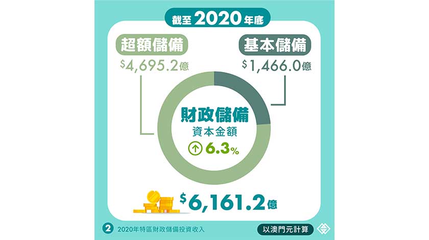 年內,特區政府首次動用共466.0億的財政儲備填補預算赤字,並將2018年度的中央預算執行結餘當中的522.6億撥入財政儲備。截至2020年底,財政儲備的資本金額按年上升6.3% 至6161.2億;其中,基本儲備及超額儲備分別為1466.0億及4695.2億。