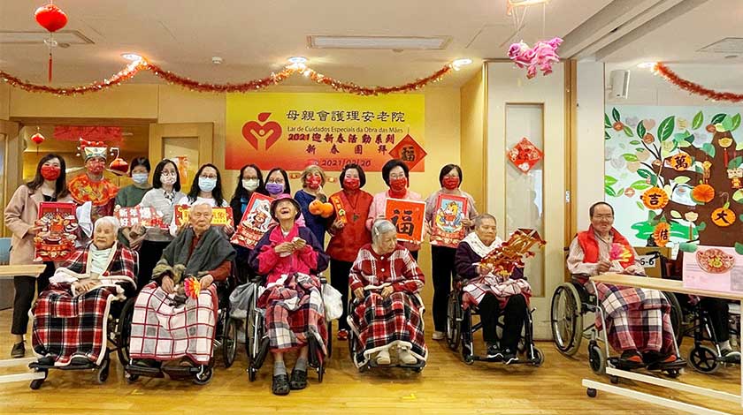 長者十分重視農曆新年這個喜慶大節日,為準備迎接牛年到來,母親會屬下安老機構臨近春節期間舉辦了「妙筆生“揮”迎春製作」、「區區有愛辦年貨」、「時來運轉行大運」、「闔家歡樂迎金牛」、「2021新春團拜」等等牛氣沖天迎新春系列活動,從院舍佈置以及賀卡製作著手,寓意「除舊佈新」;賀卡於外出辦年貨時送贈給各關愛及支持長者出行的社區商戶,以送上節日祝賀,同時表示謝意和鼓勵;在行大運遊車河時,途經熟悉的社區,既可欣賞美麗的賀年燈飾,也能感受社區的變遷,由於新冠疫情的關係,市面人流沒像以往暢旺,亦無減院友和家屬興奮的心情,大家都十份雀躍,流連忘返;院友把在超市購買到的賀年佳品佈置全盒,又透過繪畫和不同的圖片代替文字,製作出具創意的賀年揮春,如橫財就手及大吉大利等新年祝福語。
