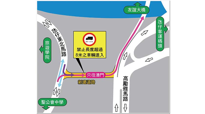【特訊】位於氹仔東北馬路往高勵雅馬路新闢的一條單向道路將於3月3日上午10時開通,新建道路全長約140米,只通往友誼大橋往澳門,且考慮到安全原因,僅供長度不超過8米之車輛通行,呼籲駕駛者留意。同時,由於新闢道路為單向通往澳門,故當懸掛八號或以上熱帶氣旋信號時,該道路將在警方安排下實施封閉交通。