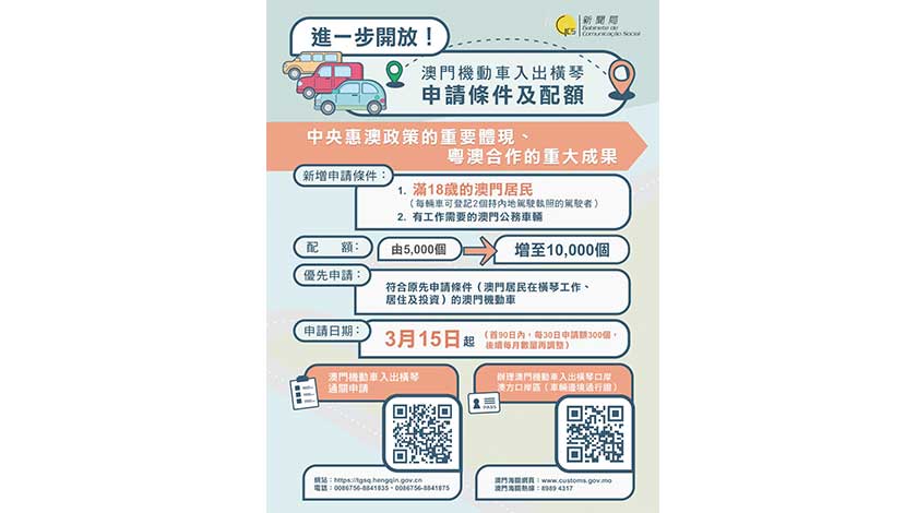 【特訊】為更便利澳門居民來往橫琴,推動橫琴粵澳深度合作區的建設,經澳珠兩地政府協商,定於本年3月15日起符合條件的澳門機動車所有人和駕駛人,可向澳珠兩地政府有關部門申請機動車入出橫琴資格,同時,配額總量由去年的5000個增加至10000個。