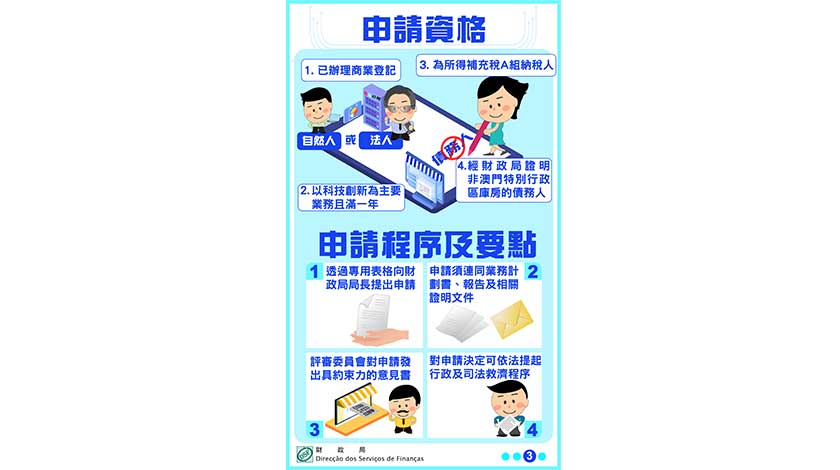 凡已辦理商業登記的所得補充稅A組納稅人,不論屬自然人或法人,只要並非澳門特區庫房的債務人,其企業主營業務符合上述科技創新業務的定義及範圍,且營運滿一年,都可透過專用表格向財政局提出申請。申請必須附同企業從事有關科技創新業務的計劃書、報告,以及其他證明文件。