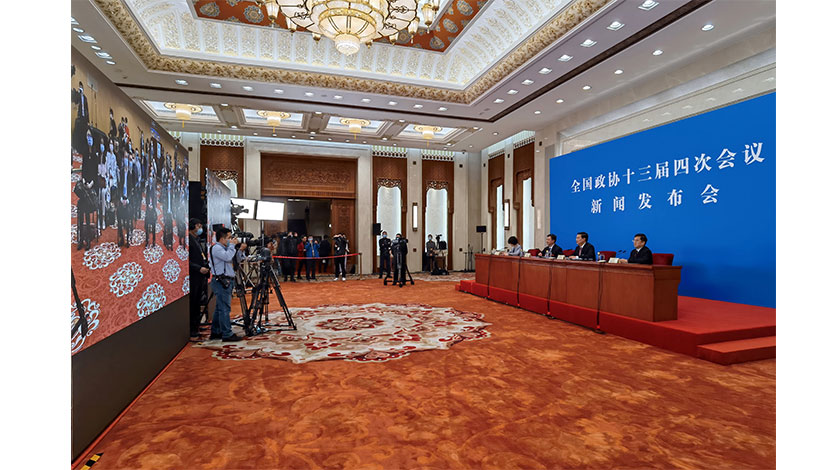 3日,全國政協十三屆四次會議新聞發佈會在北京舉行,大會新聞發言人郭衛民向中外媒體介紹本次大會有關情況並回答記者提問。為有效防控疫情,共同維護公共衛生與健康,新聞發佈會採用網絡視頻形式進行。圖為新聞發佈會主會場。(中新社發 鍾欣 攝)