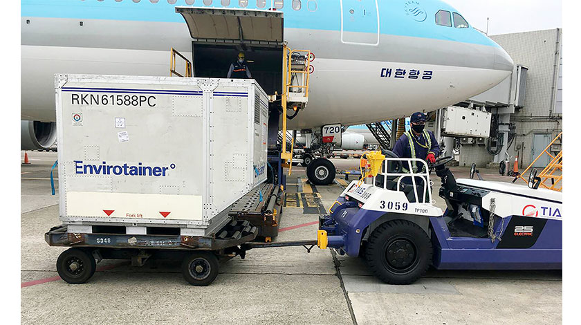 台灣流行疫情指揮中心3月3日證實,首批自阿斯利康(AZ)購買的1000萬劑新冠肺炎疫苗中,11.7萬劑疫苗已於當日上午抵台。首批疫苗裝載在1個航空貨物冷鏈專用貨櫃,由韓國大韓航空公司客機以貨艙裝貨的模式,從南韓仁川機場起飛,當天上午10時25分降落桃園機場。地勤人員駕拖車把貨櫃拖往華儲公司冷鏈倉庫中暫存,等待配送施打。(香港中通社)