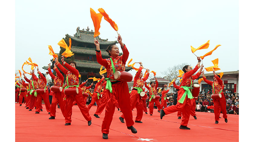 14日,在山西省臨汾市襄汾縣陶寺村,民間社火隊在『二月二龍抬頭』演出活動中表演傳統腰鼓。當日是農曆二月初二,人們在豐富多彩的民俗活動中歡慶傳統節日。新華社發(李現俊 攝)