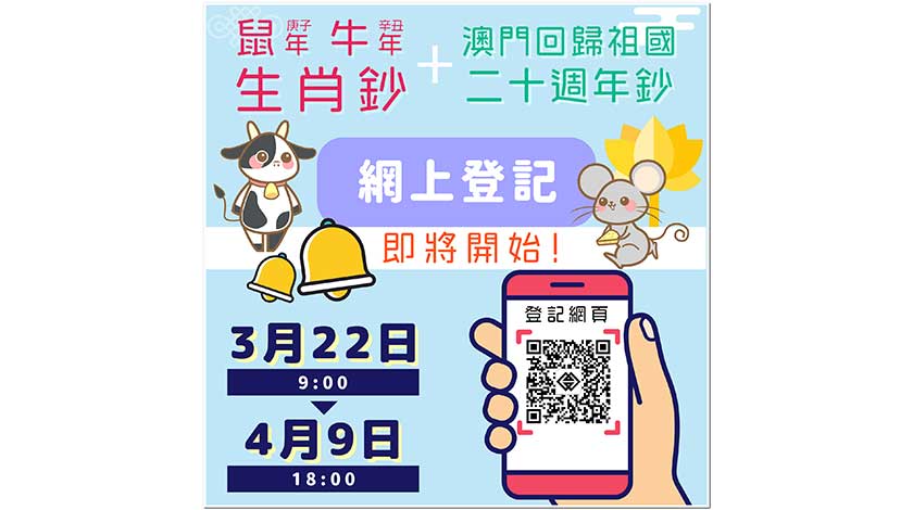 【特訊】鼠年及牛年生肖鈔,以及早前已發行的澳門回歸祖國二十週年鈔之網上登記將於2021年3月22日(上午9時起)開始,屆時接受澳門居民進行網上預約兌換登記,為期三個星期,至2021年4月9日下午6時止。