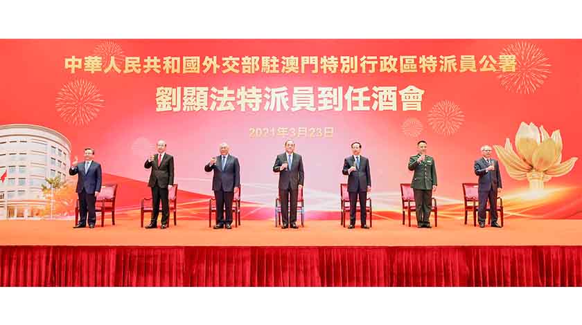 【特訊】2021年3月23日,外交部駐澳門公署新任特派員劉顯法攜夫人李萍在中葡綜合體舉行到任酒會。澳門特區行政長官賀一誠、全國政協副主席何厚鏵、中聯辦主任傅自應、駐澳門部隊副司令員戴勁松、澳門立法會主席高開賢、澳門終審法院院長岑浩輝、特區政府主要官員、外國駐澳總領事、澳門各界知名人士和中資企業代表等近500人出席。