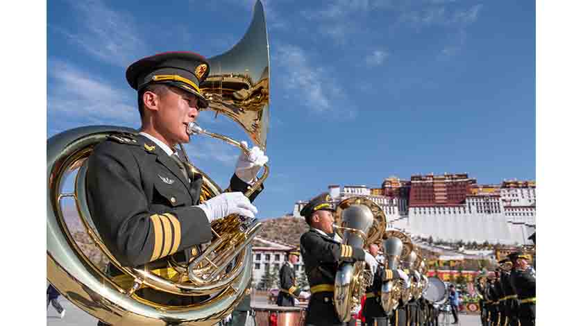 3月28日,西藏各族各界民眾聚集在拉薩布達拉宮廣場,昇國旗、唱國歌,慶祝西藏百萬農奴解放紀念日。圖為軍樂團在布達拉宮廣場進行演奏。中新社記者 江飛波 攝