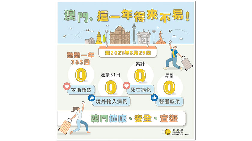 在昨午的新型冠狀病毒感染應變協調中心新聞發布會,戴華浩率先宣布他口中的「好消息」:截至昨日,本澳已整整一年,即三百六十五日沒有本地確診病例。他提出,這是本澳防控取得的好成績,值得自豪,更值得大家珍惜。雖然一些較嚴厲的防疫措施可能會造成市民不便,希望市民諒解並繼續堅持。