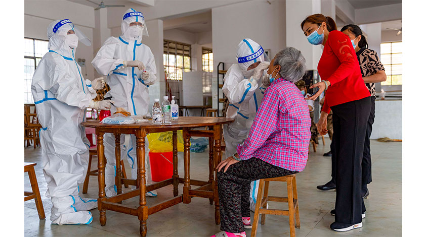 3月31日,在瑞麗市猛卯鎮猛卯村一檢測點,醫護人員採集一名老人的核酸樣本。30日0時至24時,雲南省新增確診病例6例,新增無症狀感染者3例,均在瑞麗市。(新華社記者 陳欣波 攝)
