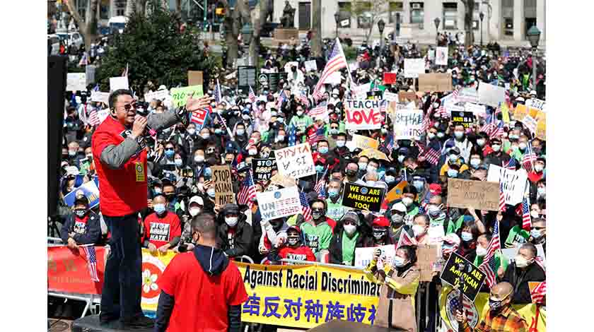 當地時間4月4日,紐約舉行反仇恨亞裔大遊行,上萬民眾手持標語在曼哈頓弗利廣場集會後,遊行穿過布魯克林大橋至布魯克林卡德曼廣場。圖為美國亞裔社團聯合總會會長陳善莊在遊行前的集會上講話。中新社記者 廖攀 攝