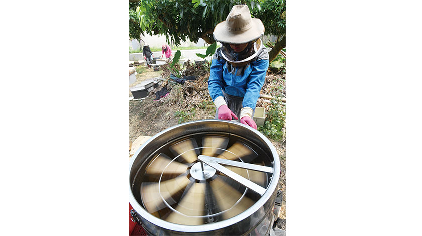 清明節前後正是荔枝、龍眼開花的季節,也是採收蜂蜜的季節,蜂農每三天就可以收一次蜂蜜。4月5日,蜂農一早就到果園採收蜂蜜。今年雨水少,果蜜又充足,台灣嘉義蜂蜜就創下20年來最大豐收,而且採收出來的蜂蜜,水份含量剛好在20%左右,讓饕客讚不絕口,看著大片等著採收的蜂巢,也讓蜂農笑得好開心。圖為蜂農全副武裝採收蜂蜜。(香港中通社圖片)