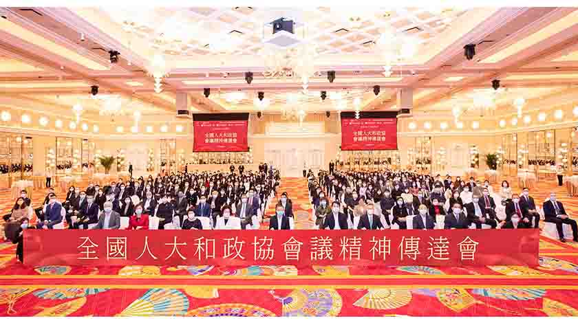 【特訊】永利於昨(9)日下午三時假永利皇宮宴會廳,主辦「全國人大和政協會議精神傳達會」,活動得到澳門婦女聯合總會、鏡湖慈善會、中華文化交流協會、澳門日報和澳門中華教育會支持,並獲中央人民政府駐澳門特別行政區聯絡辦公室協調部指導。澳區全國政協委員、婦聯會長賀定一、澳區全國政協委員吳培娟、澳區全國人大代表崔世平、澳區全國人大代表陸波及澳區全國人大代表黎世祺親臨現場,向永利團隊成員分享全國兩會精神及發展概況,就國家工作報告、「十四五」規劃、愛國教育工作等方面進行了深入探討。本次全國兩會精神傳達會也邀請了澳門科技大學副校長龐川教授,作為傳達會會議上的客席主持人。