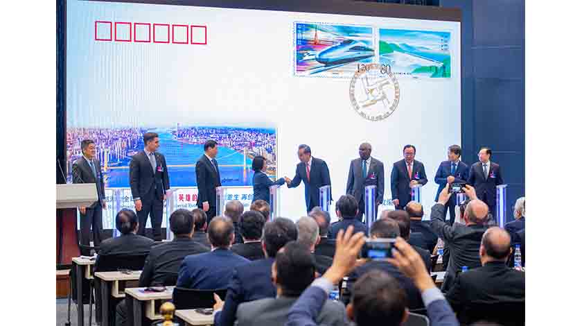 4月12日,中國外交部湖北全球特別推介活動在北京舉行,國務委員兼外交部長王毅(左五)、湖北省委書記應勇(左三)及外國駐華使節代表等中外嘉賓共同為外交紀念封揭幕。中新社記者侯宇攝