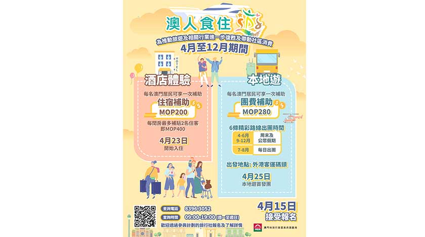 包含本地遊及酒店體驗資助“澳人食住遊”於今年四月至十二月推行,每名澳門永久或非永久居民可分別獲本地遊及酒店體驗資助一次,本地遊活動期為四月廿五至十二月三十一日,當中,四至六月及九至十二月期間逢週末及公眾假期出團,計劃七至八月暑假期間增至每日出團。首階段率先推出本地主題深度遊路線,除了保留去年深受澳門居民歡迎的直升機體驗外,今次設計路線時更特別加入“旅遊+文化”,“旅遊+體育”,“旅遊+生態”等新亮點。六條路線的內容包括:九澳聖母村古建築群探秘,路氹城生態保護區科普學習,澳門VR /名人蠟像館體驗,澳門格蘭披治大賽車及回歸博物館,青少年音樂文化欣賞體驗,直升機飛天體驗及遊艇打卡等,每名澳門居民可獲最多280澳門元本地遊旅費補助一次,以及一百澳門元餐飲卡(直升機飛天體驗及遊艇打卡路線除外)。資助後六條路線的團費幅度介乎二十八元至五百一十八元之間,備有粤語葡語及英語團以滿足不同澳門居民的需求。