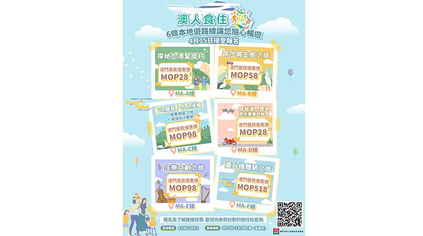 【本報訊】由旅遊局統籌,澳門基金會資助;澳門旅行社協會、澳門旅遊商會及澳門旅遊業議會三會組成工作小組承辦的「澳人食住遊」,本地遊出團日期最早為由四月二十五日,六條路線本地酒店體驗及由今早十時起可報名,本地遊路線加入了“旅遊+文化”、“旅遊+體育” 、“旅遊+生態”等新亮點;而本地酒店體驗則由四月二十三日開始 。旅遊局局長文綺華表示,「澳人食住遊」目的是維持旅行社、導遊、司機及相關就業人員生計的同時,為澳門居民提供更加經濟實惠的食住遊計劃,促進內需及帶動社區消費,推動旅遊及相關行業進一步復甦,呼籲市民踴躍參與計劃。