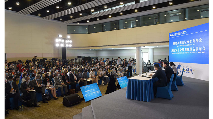 18日,博鰲亞洲論壇2021年年會在海南省博鰲舉行新聞發布會暨旗艦報告發布會,會上發布了《亞洲經濟前景與一體化進程》2021年度報告和《可持續發展的亞洲與世界2021年度報告——世界大變局下的可持續復蘇之路》。(中新社記者侯宇攝)