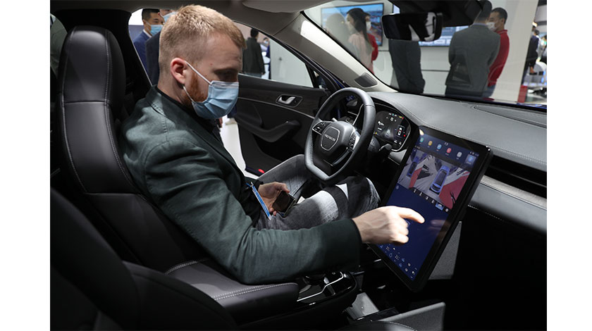 4月19日,華為在2021上海車展上展出了華為智能汽車解決方案的多項技術。其中,鴻矇OS車機操作系統能提供車輛『一芯多屏』的解決方案,成為展台一大亮點。此外,華為的ADS自動駕駛,智能車雲服務,車機智能交互等技術也備受關注。圖為外國觀眾在車內體驗鴻矇OS車機操作系統。(中新社記者張亨偉攝)