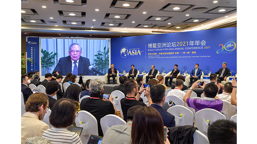 21日,博鰲亞洲論壇2021年年會舉行『雙循環的中國新發展格局』分論壇。圖為博鰲亞洲論壇諮委會副主席、中國國務院原副總理曾培炎通過視頻連線方式作主旨演講。(中新社記者駱雲飛攝)