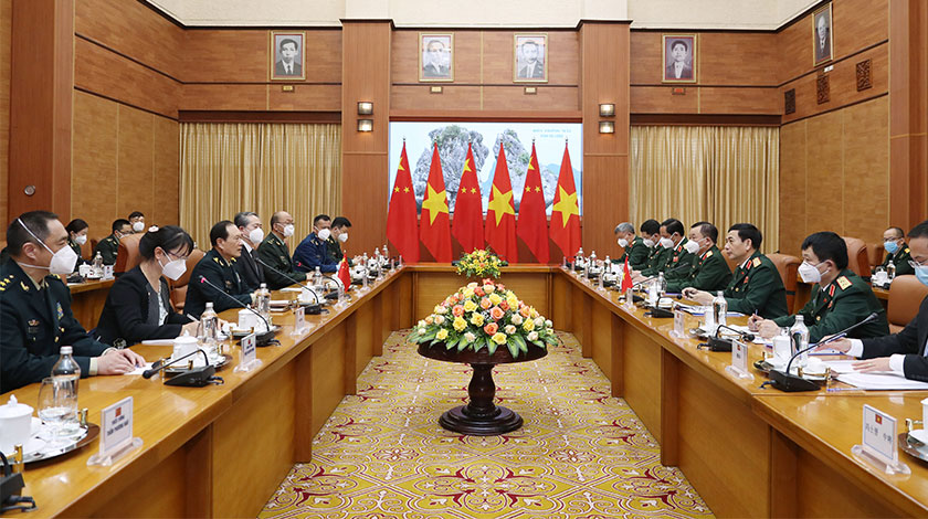 4月25日下午,中國國務委員兼國防部長魏鳳和(左三)與越南國防部長潘文江(右三)在河內舉行會談。新華社發(李曉偉攝)
