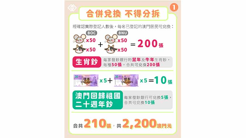經確認實際登記人數後,每名已登記的澳門居民可兌換每家發鈔銀行發行的庚子鼠年和辛丑牛年生肖鈔各50張、澳門回歸祖國二十週年鈔各5張,即合共可兌換鈔票總數量為210張,兌換所涉及金額為2200澳門元。