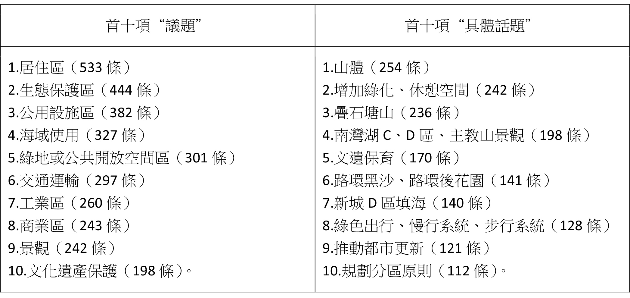 總體規劃草案熱門具體話題前十位排列依次是「山體」、「增加綠化、休憩空間」、「疊石塘山」、「南灣湖C、D區、主教山景觀」、「文遺保育」、「路環黑沙、路環後花園」、「新城D區填海」、「綠色出行、慢行交通、步行系統」、「推動都市更新」、「規劃分區原則」。