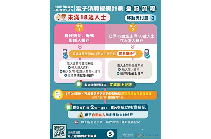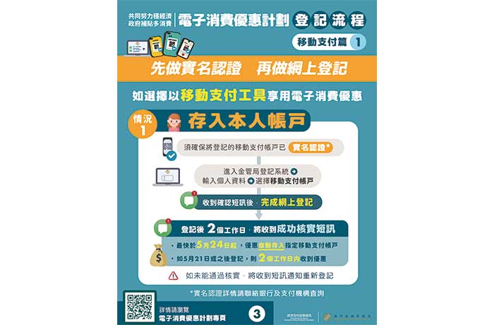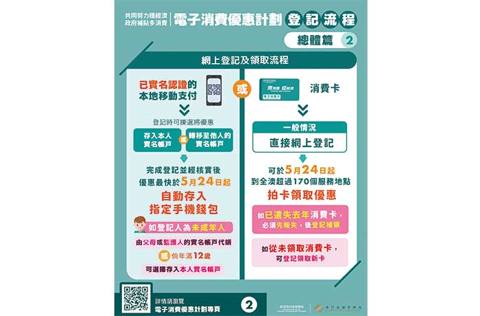 【本報訊】幾經波折的電子消費優惠計劃終要上馬,將於五月七日(明日)起接受居民網上登記選用要實名認證的聚易用八間移動支付或沿用舊消費卡,最快本月二十四日起發放八千元消費金,六月(下月)一日就開始使用。