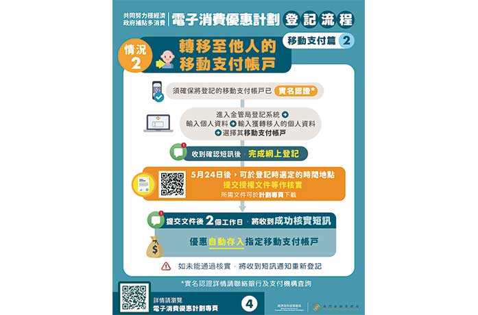 居民如選擇電話移動支付的方式,需先向有關金融機構開通實名認證帳戶。在登記時可選把優惠存入本人指定的實名帳戶,或轉移至他人的實名帳戶。如選消費卡,登記時在輸入個人資料後,可直接揀選消費卡。如已遺失,需先向警方報失,再登記補領新卡。