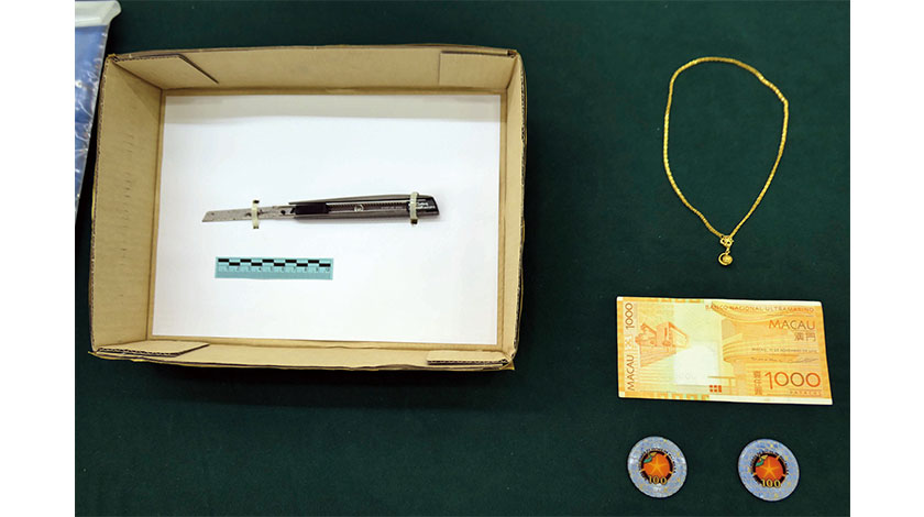 司警員據報展開調查,透過天眼和附近錄像,鎖定郭的資料,得知他作案後到金行變賣所得金鍊,獲款五千多元,司警隨後到金行起回事主的金鍊。至晚上十時許,司警員到新口岸某賭場拘捕郭姓男子,在他身上搜出他犯案時所用的美工刀,一千元現金和兩個面值一百元的籌碼。