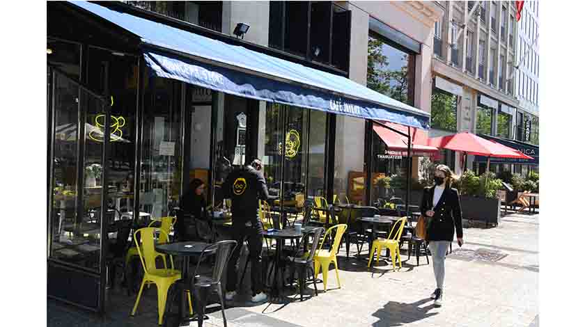 當地時間5月19日,法國啟動第二階段“解封”,部分恢復開放文化和餐飲場所。在巴黎市中心香榭麗舍大街,大多數餐飲場所已經恢復在露天平台的營業。中新社記者李洋攝