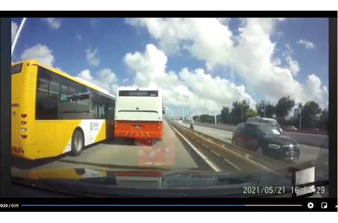 此外治安警察局昨日表示,根據網絡社交平台上流傳的一段關於巴士在友誼大橋引橋危險切線的短片作出調查。經翻查道路視頻監控,證實有關事件發生在(5月21日)約16時,兩輛巴士沿友誼橋大馬路往氹仔方向行駛,其中一輛巴士沿右車道行駛,當駛至友誼大橋引橋時在沒有確保安全情況下切向左線,並幾乎與左車道並排行駛中的一輛巴士發生碰撞,逼使左車道的巴士減速讓其轉入左線。