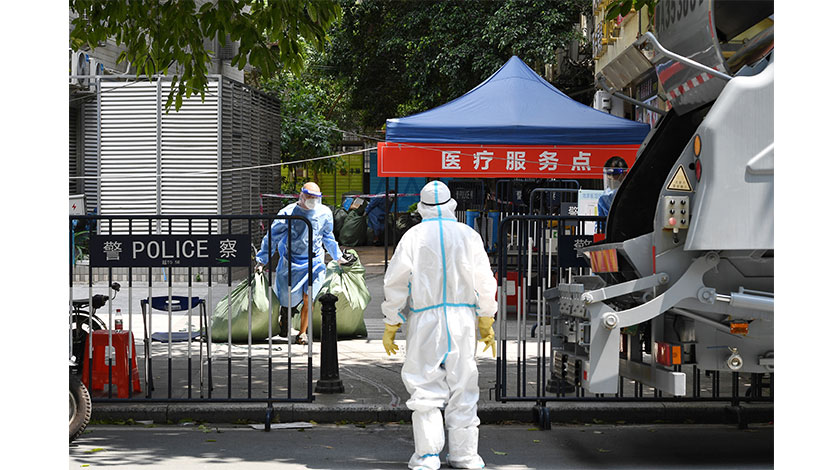 6月6日,廣州市越秀區,工作人員在北京街道仙湖社區惠福西路398號附近處理疫情垃圾。當日,廣州市越秀區北京街道仙湖社區惠福西路398號由低風險地區調整為中風險地區。(中新社記者陳楚紅攝)