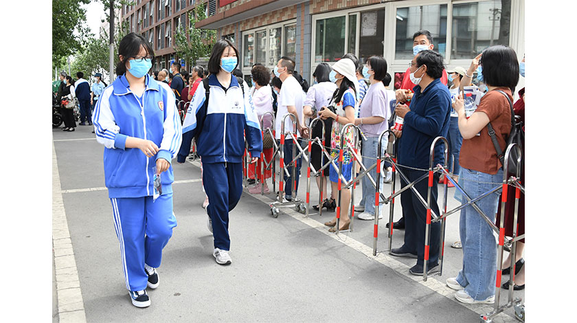 6月7日,在中国农业大学附属中学考点外,参加完高考首场科目考试的考生走出考场。当日,2021年高考拉开帷幕。(新华社记者 任超 摄)