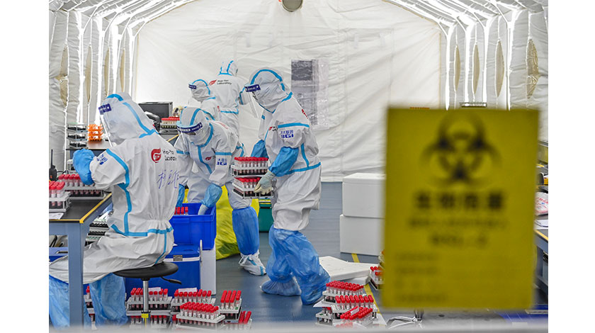 7日,廣東省廣州市,工作人員在『火眼』實驗室內工作。6月5日,經連夜建設,僅用10小時建成的15萬單管日通量的華大『火眼』實驗室,落地廣州番禺亞運城綜合體育館,是目前全國最高日檢測通量的單體實驗室。若採用10混1混採技術,每日最高可檢測150萬人份核酸樣本。目前該實驗室已正式接樣檢測。(中新社記者陳驥旻攝)