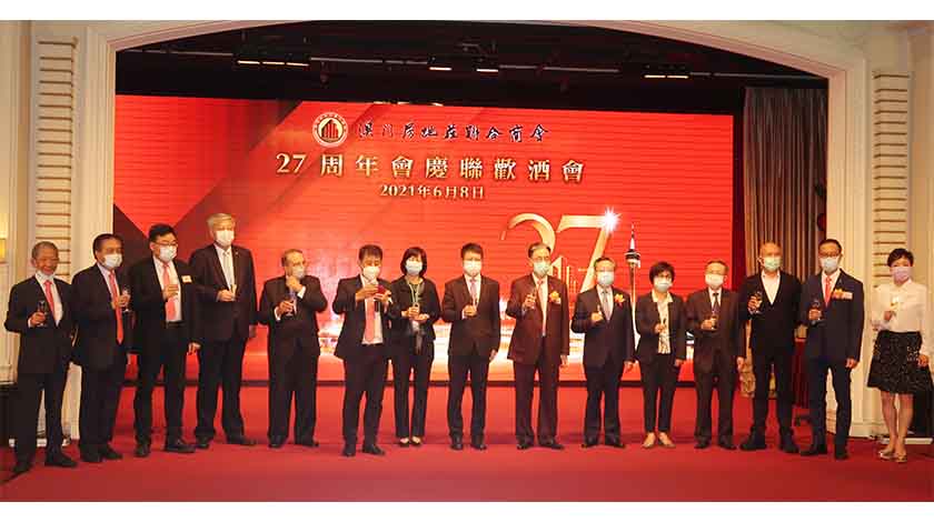 澳門房地產聯合商會昨假萬豪軒舉行「二十七周年會慶」,邀請中聯辦公室經濟部副部長左祥華、澳區全國人大代表、立法會主席、澳門中華總商會理事長兼澳門房地產聯合商會名譽會長高開賢、工務局局長陳寶霞、法務局局長劉德學、統計暨普查局局長楊名就,以及該會榮譽會長鄺達財、會長吳在權、常務副會長李廣志、理事長關偉霖等嘉賓出席。