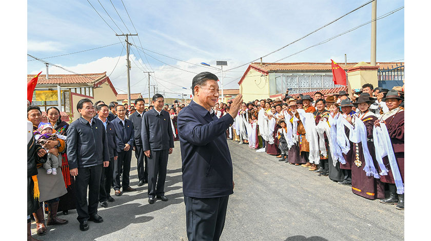 6月7日至9日,中共中央總書記、國家主席、中央軍委主席習近平在青海考察。這是8日下午,習近平在海北藏族自治州剛察縣沙柳河鎮果洛藏貢麻村考察時,向村民們揮手致意。(新華社記者 謝環馳 攝)