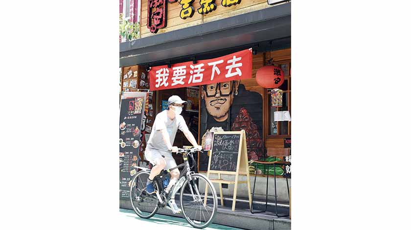 台灣疫情爆發且日益嚴峻,餐飲業的生意受到嚴重衝擊,只可提供外帶外送服務。端午節台北市東區幾家日式餐廳仍然開門營業,但門可羅雀,只能掛出布條“我要活下去”,表達無奈。香港中通社圖片
