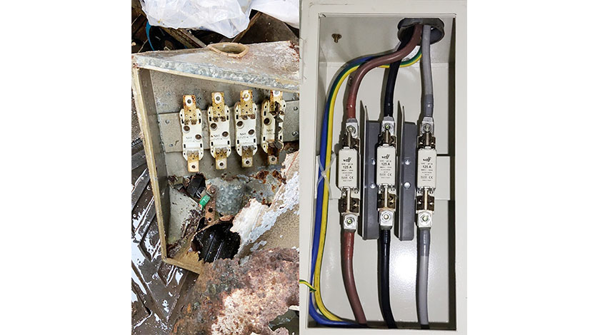 位於群隊街的輝安大廈,其上升線總電箱外殼嚴重生鏽,甚至已出現破洞,失去保護作用,隨時會受外部滲水影響,或有機會被老鼠咬破電線導致短路,嚴重時更可能會發生火警。澳電的「低層舊廈公共電力裝置安全升級資助計劃」以保障公眾安全為準則,優先處理這種存在即時用電危險的個案。輝安大廈的升級工程覆蓋整幢大廈的公共電力裝置,包括更換低壓總配電櫃、上升總掣板、電錶箱、上升總線及上升線分線箱,有關裝置於升級後已符合現行的澳電電力技術規範。此外,考慮到住戶在未來可能增加的用電需求,升級時亦已增加大廈公共電力裝置的供電容量。