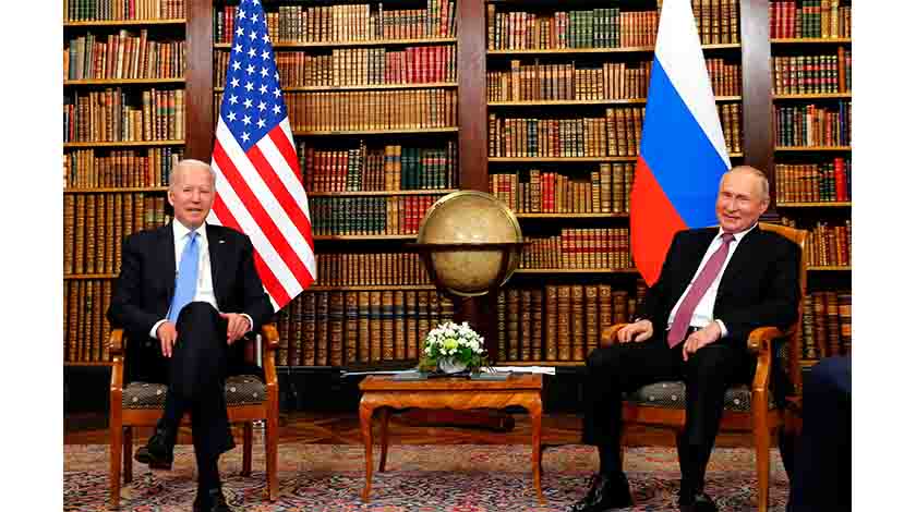 美國總統喬•拜登(左)和俄羅斯總統弗拉基米爾•普京 6 月 16 日在瑞士日內瓦拉格蘭奇別墅會面。(鄧尼斯•巴里布斯/新華社)